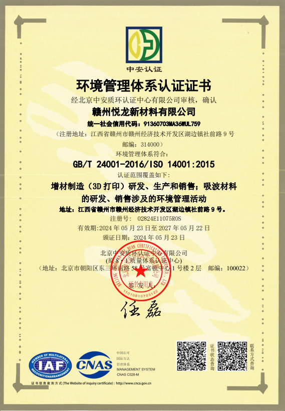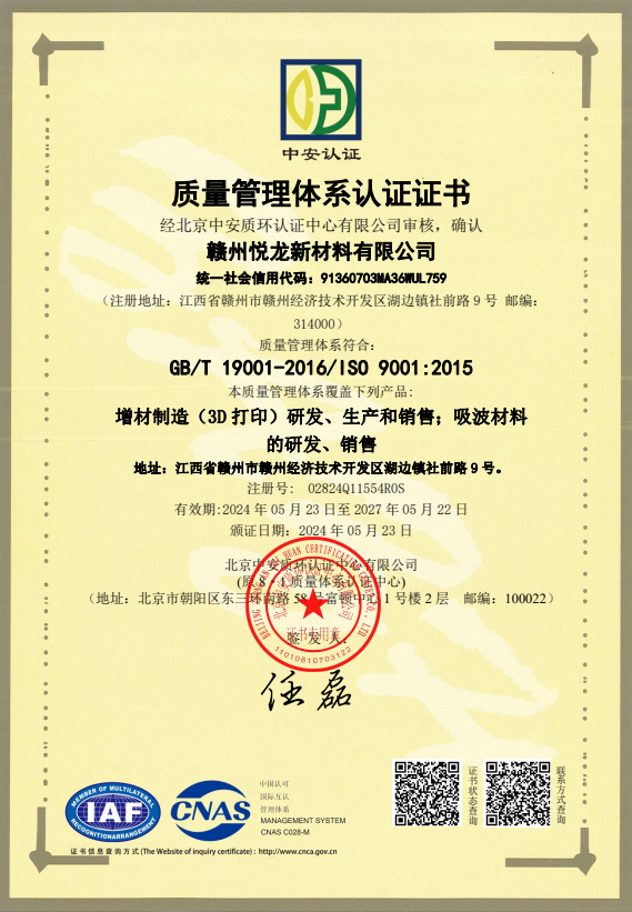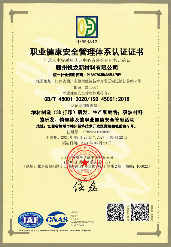 2024年3月,赣州悦龙新材料有限公司顺利通过ISO9001(质量管理体系)、ISO14001(环境管理体系)和ISO45001(职业健康安全管理体系)“三标”管理体系权威认证。这标志着悦龙新材公司规范化、标准化、体系化管理迈上新台阶,在产品及服务质量、环境、职业健康安全方面的管理已达到ISO三体系的标准要求,也有实力为客户提供更高品质的产品和服务。